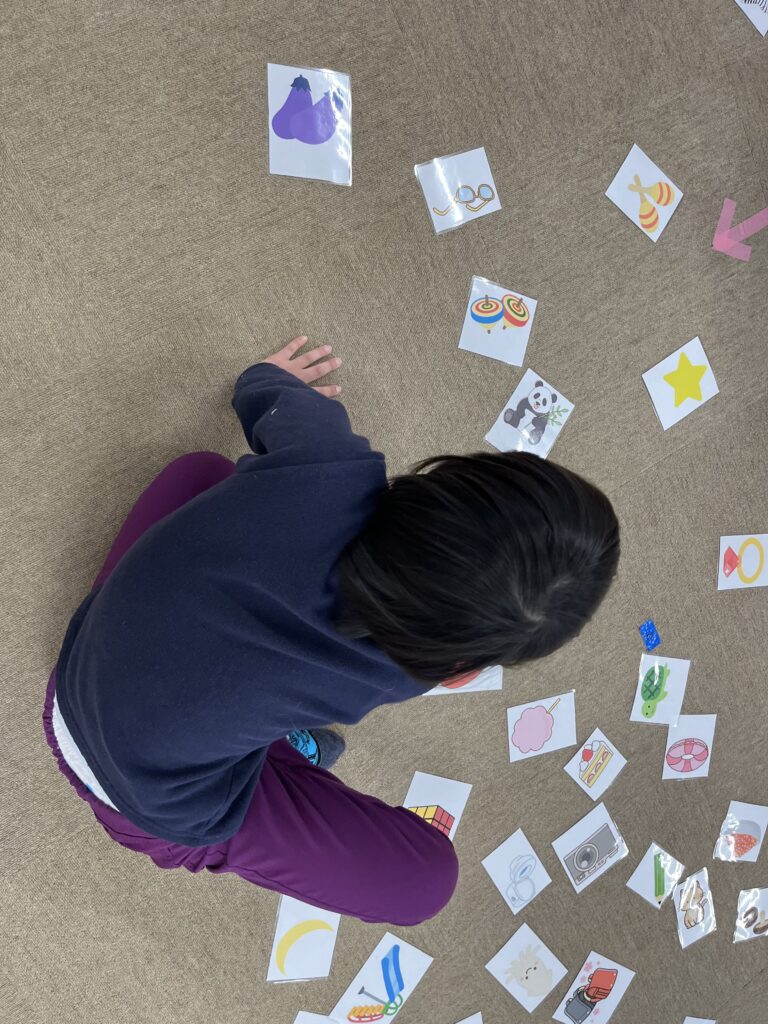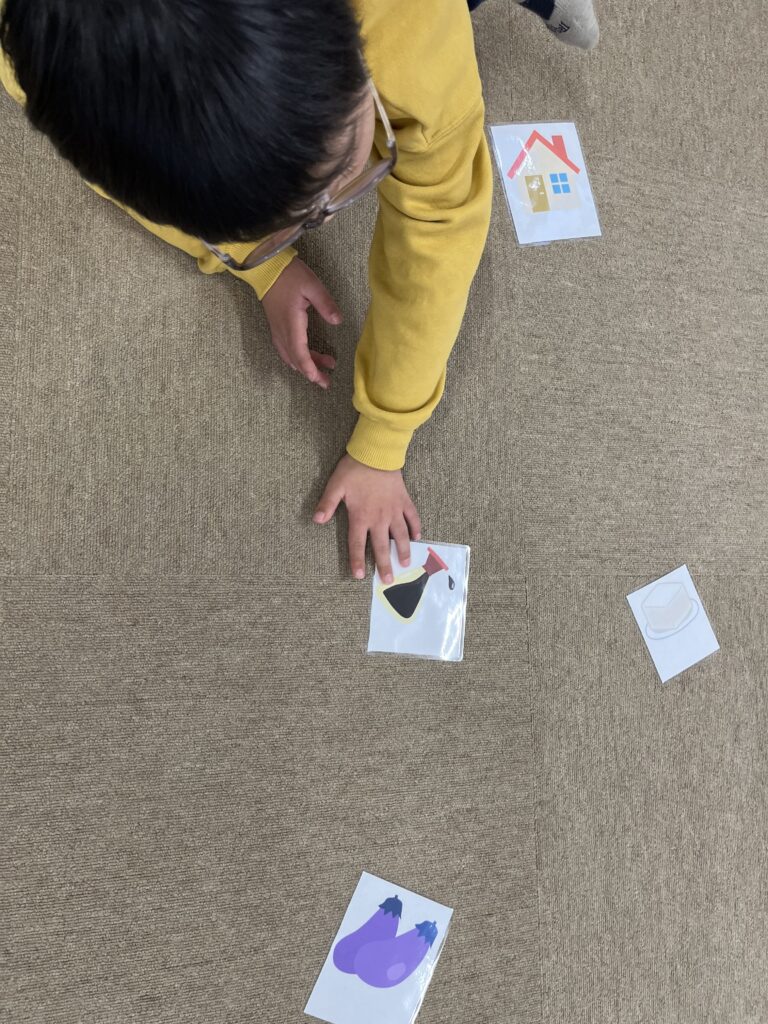 今週のイベントはしりとりカードです!様々なイラストの書かれたカードからしりとりを完成させるゲームです!口頭で取り組むよりも視覚から言語を連想し繋ぎ合わせなければいけないので難しいかな!?と思いきやたくさんのカードを繋ぎ合わせることができました!!