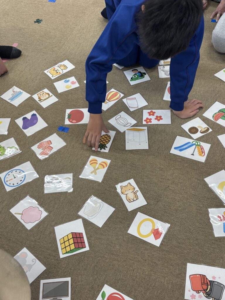子どもたちから「この言葉もそうじゃない?」と絵カード以外の言葉も出てきていました。今度はその言葉も入れた絵しりとりをしたいですね!