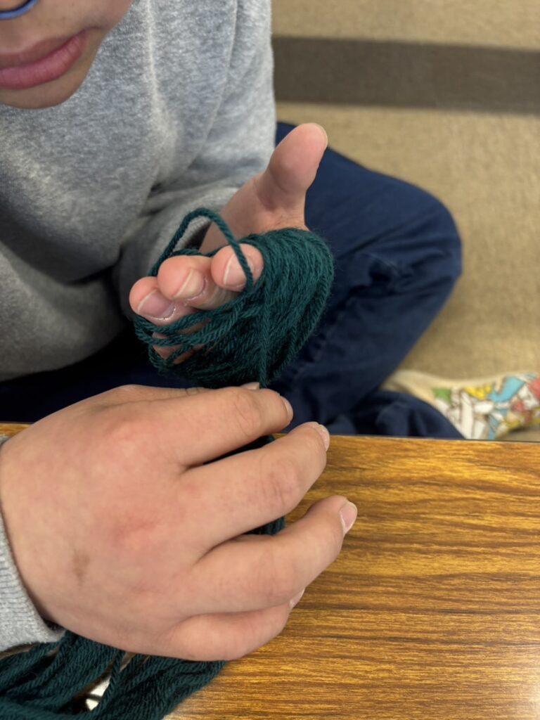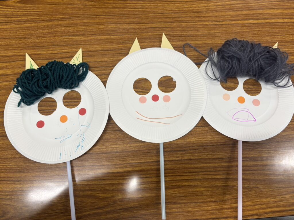 今週のイベントでは鬼のお面を作っています!!目の穴の空いた紙皿に口を書きほっぺた鼻をつけ自分で巻いた好きな色の毛糸につのをつけて完成!覗き込み互いにいないいないバァをしている姿が微笑ましかったです!完成した人からもう一つの作品を作りました!別パターンの鬼を作り飾る予定です!!