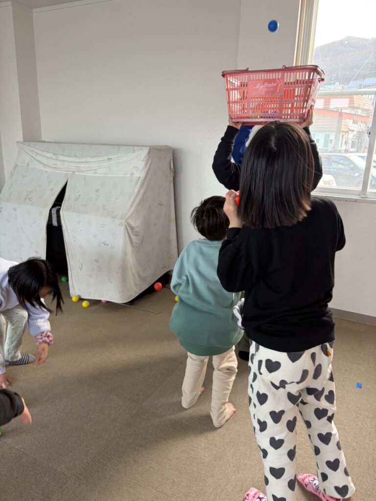 今日は、いつもとは少し違ったスタイルでボール入れを楽しみました。スタッフがカゴを高い位置に上げ、まるで玉入れのようなチーム戦に挑戦しました。