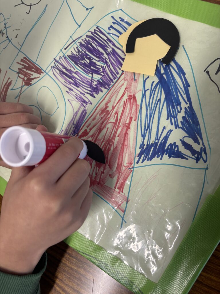 次は顔のパーツ作り。髪の毛を貼り、自分で顔を描きました。いろいろな表情のお雛様ができました。