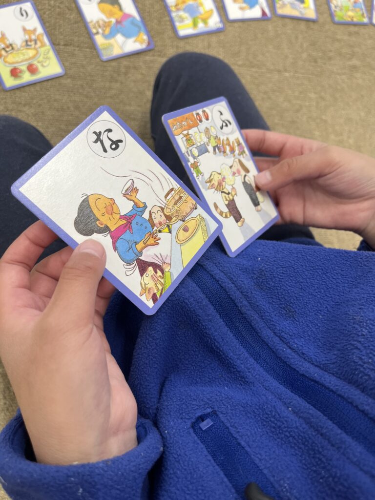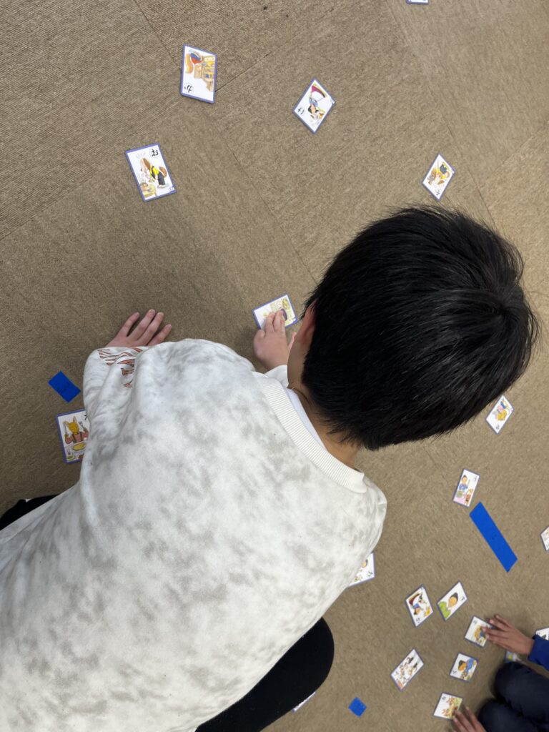 今週のイベントはカルタ取りです!絵札から少し離れたところからスタートし読み札を読み終わったと同時に取りに行くというゲームを取り入れながら楽しみました!同時に取ってしまった時にはじゃんけん!公平に取り合い楽しむ方ができました!!!