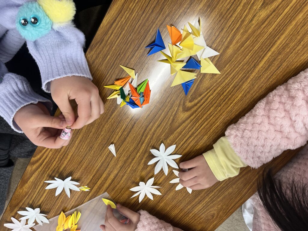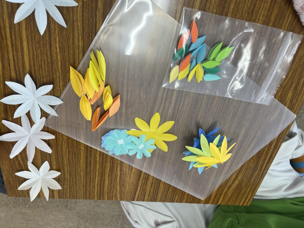今週のイベントはお花作りです!今日は花びら作りからスタートしました!折り方の説明をよく聞き折ることができました!自分だ作った花びらを合わせて一つのお花に!0から完成まで自分で取り組むことができました!すごい集中力であっという間にイベントが終わってしまいました!