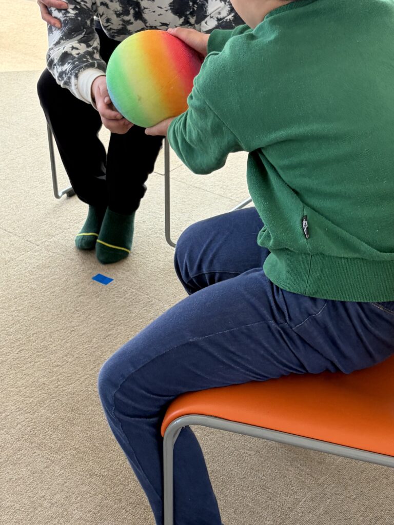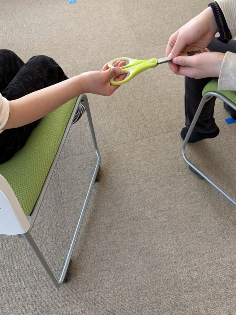 その後はボールやハサミなどを相手に、どのように渡したら危なくないのか?どのように渡したら相手が受け取りやすいのか?など考え意見をだし学びました