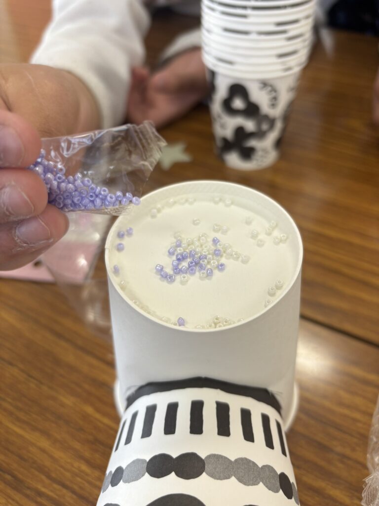 最初はなかなか跳ねなくて「どうしたらいいんだろう…」という表情もありましたが、コツをつかんだ瞬間、ビーズがピョンッと跳ねて大喜び。