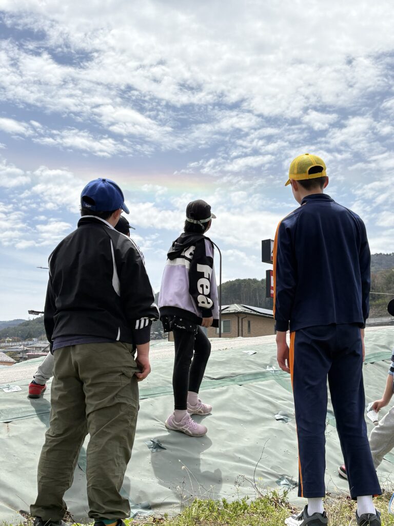 外で遊んでいる時、空に虹がかかってるのを見つけてみんなで見上げてる様子が素敵でした!