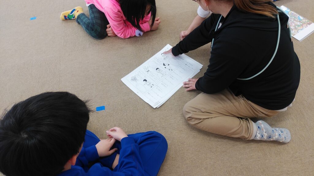 Aチームは間違い探しと絵を見て場面の答え方をお友達とスタッフと考えました。