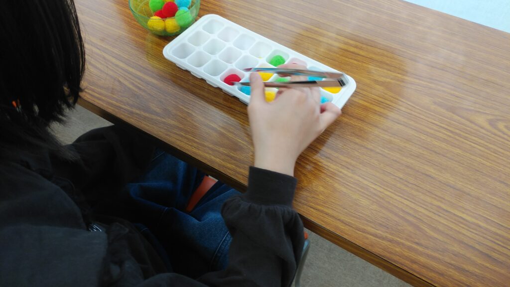 Bチームはお箸の持ち方とお箸を使って物を掴んだり、名前の練習をしました。スタッフと一緒にやると上手にできますが中々癖が抜けずに苦戦してました。