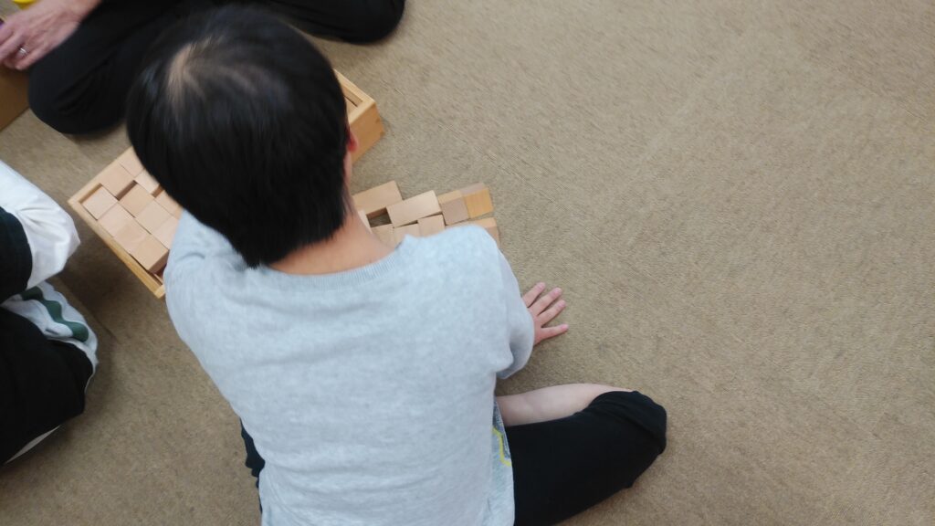 Cチームはペグ指しと積み木をやりました。最初はイヤイヤながらも興味を示すと楽しそうにやっていました。
