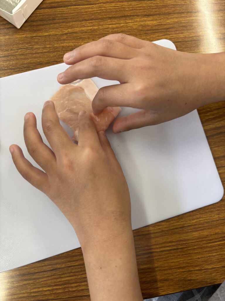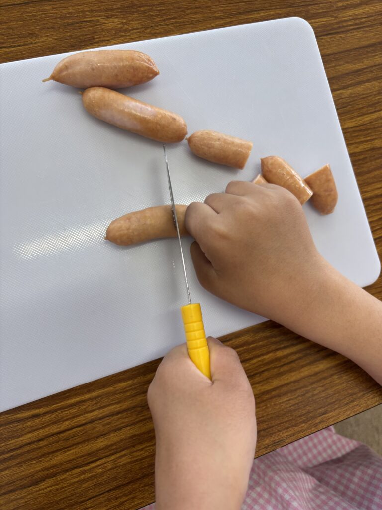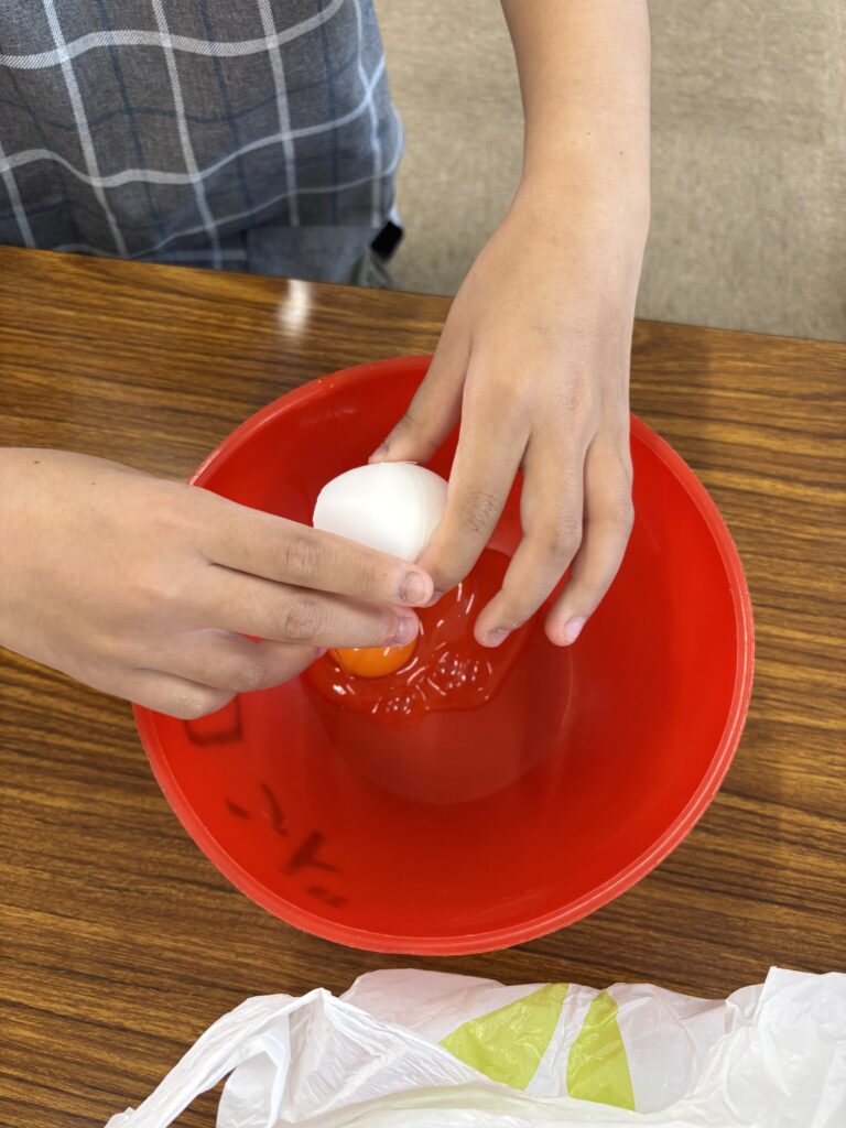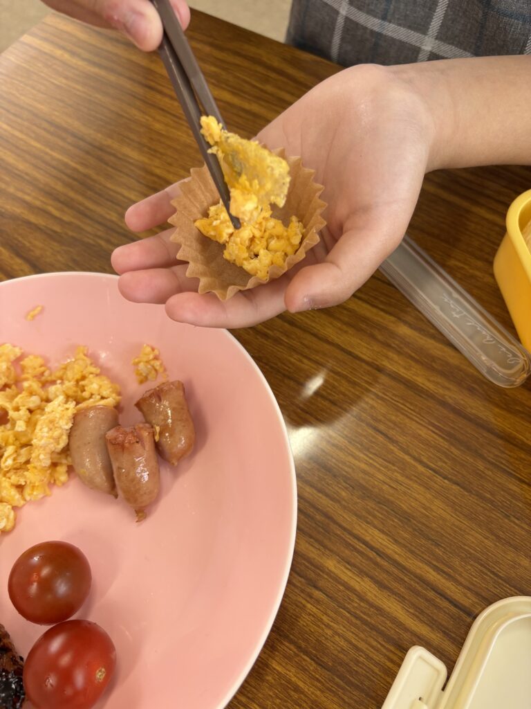 みんなでスクランブルエッグと肉巻きを作りました!卵を混ぜたりお肉を焼いたり。みんなで作業を分担して作ります。