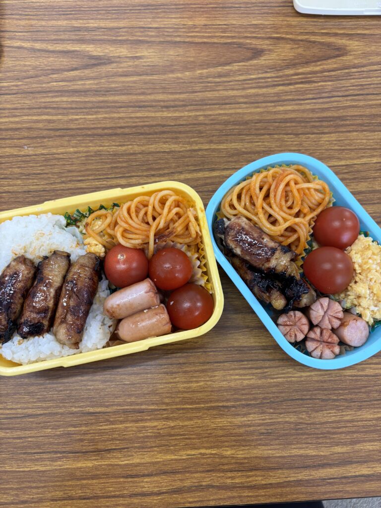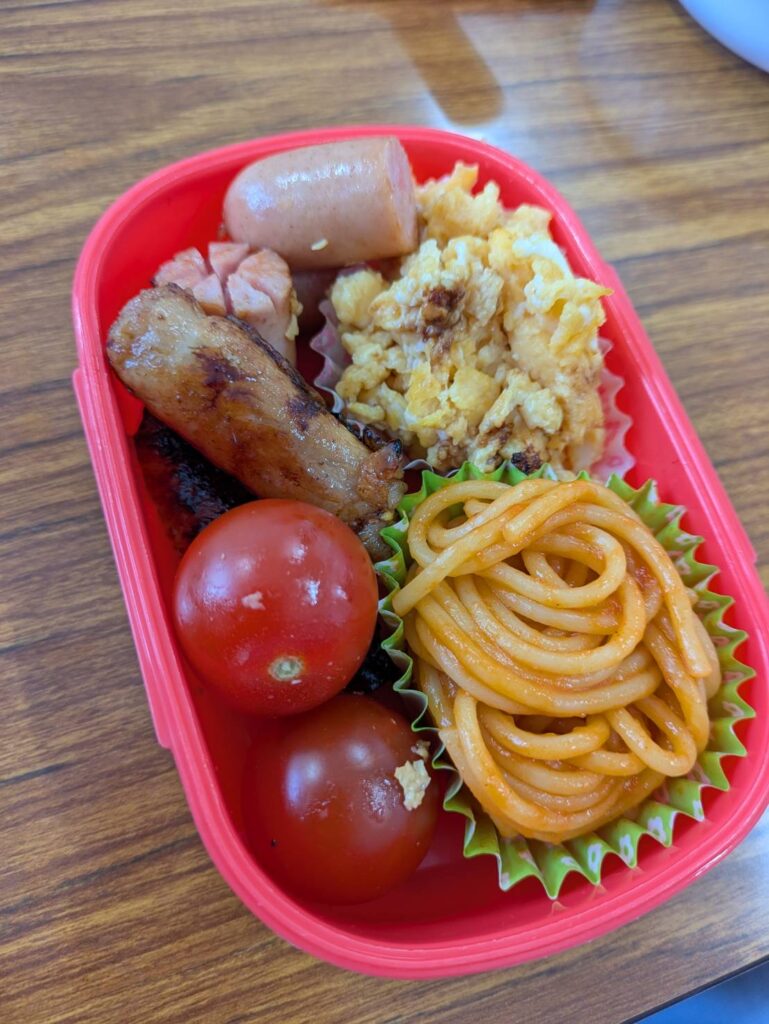 おかずはスクランブルエッグ、肉巻き、プチトマト、パスタ、ウインナーの5種類。