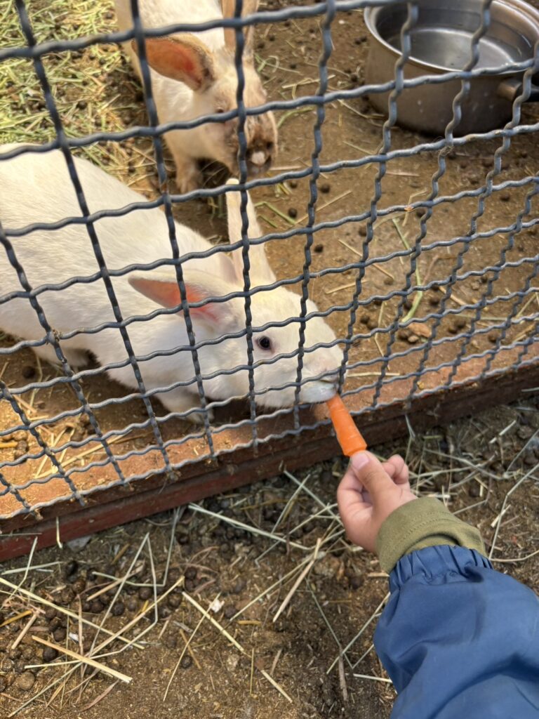 途中で出会ったヤギやウサギにも興味津々で、餌やりに挑戦する姿も。